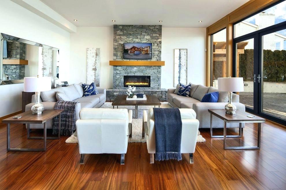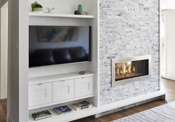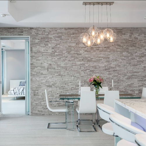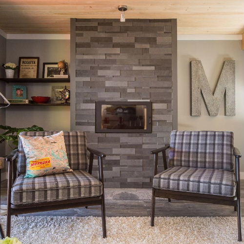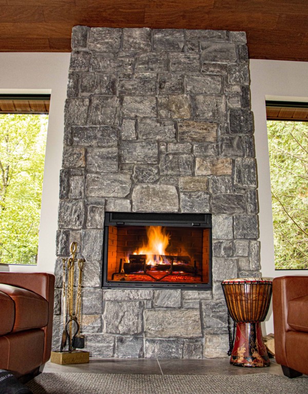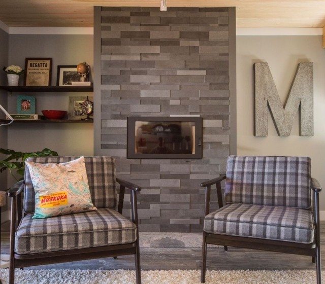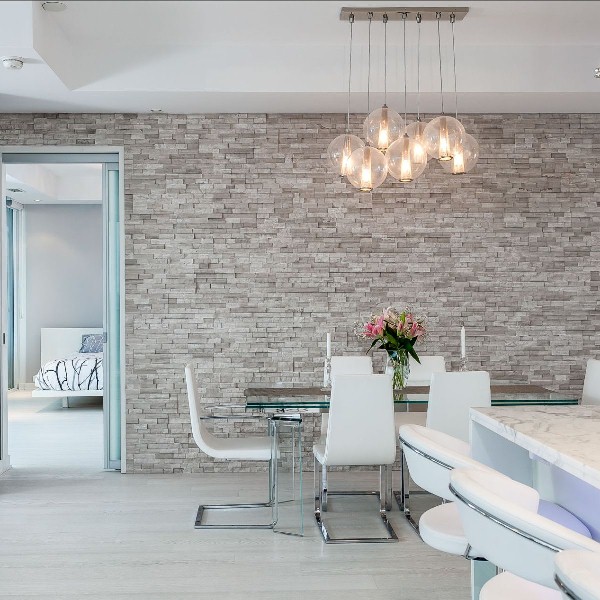 Stone cladding on entire wall provides lovely backdrop and texture to this modern update.