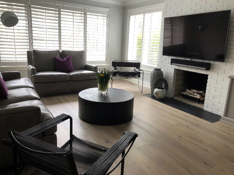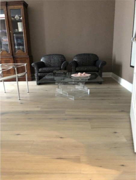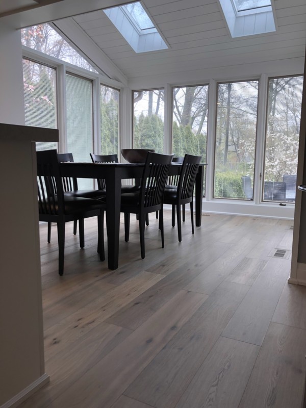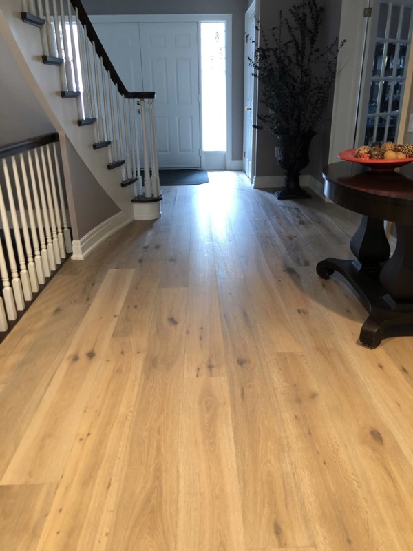 Wider width, light-colored, new hardwood flooring |