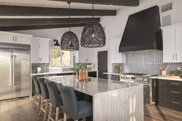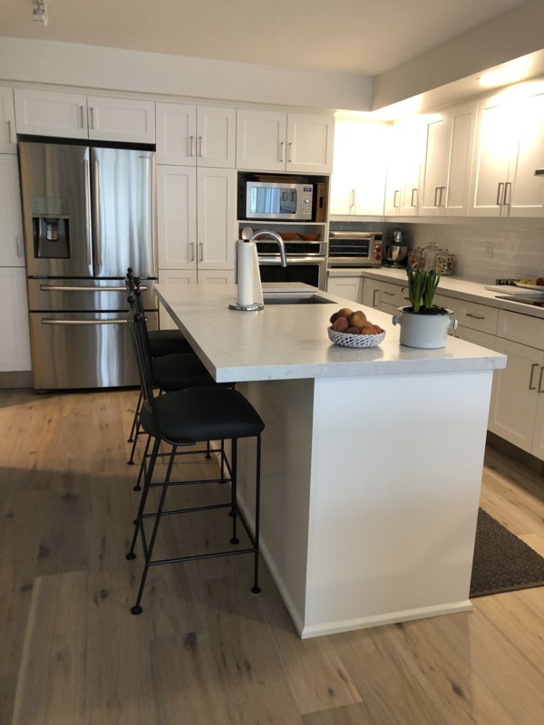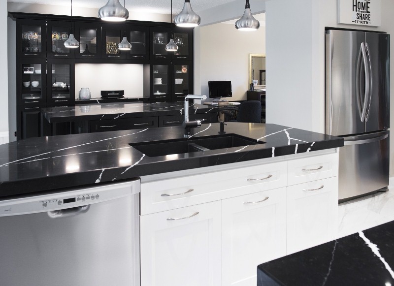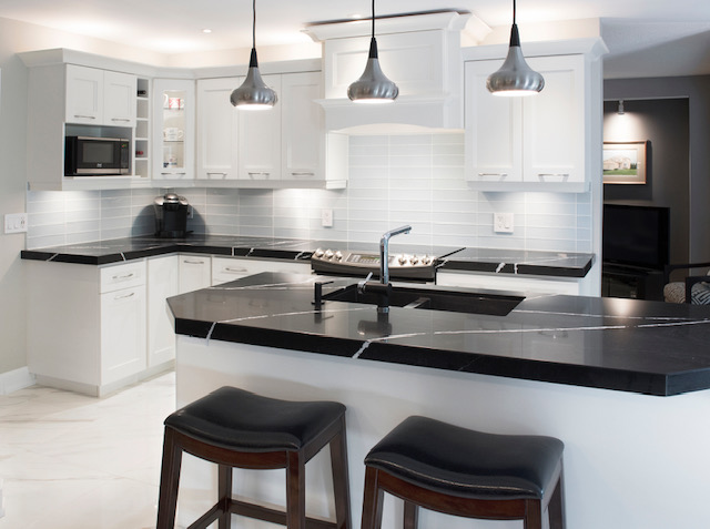 Contrasting Silestone counters pop against the new white cabinets in this 1970s update |