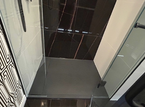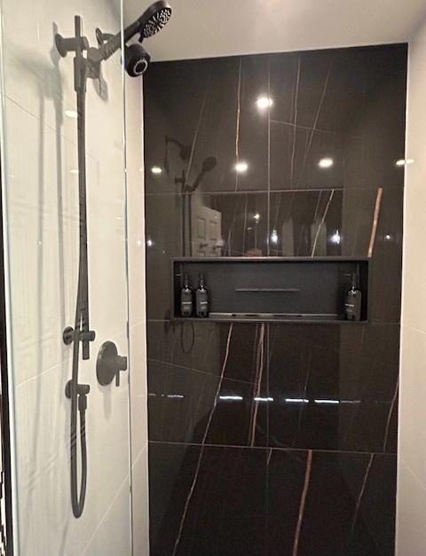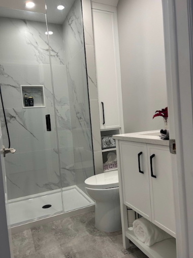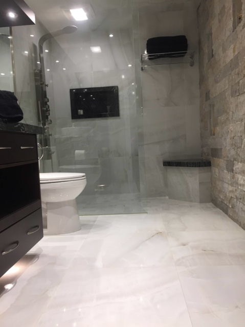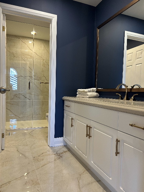 Bath reno includes large curbless shower. |