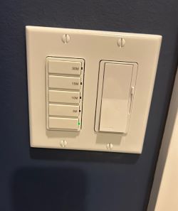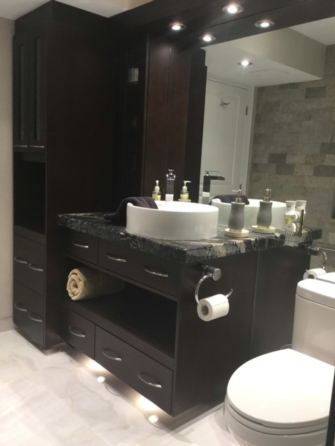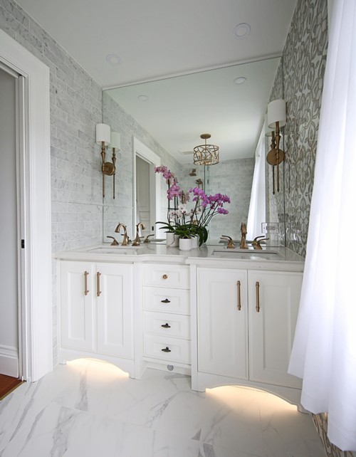 Custom under-cabinet lighting (at floor) for those middle of the night trips to the washroom. |