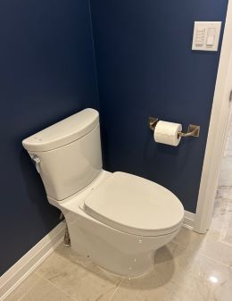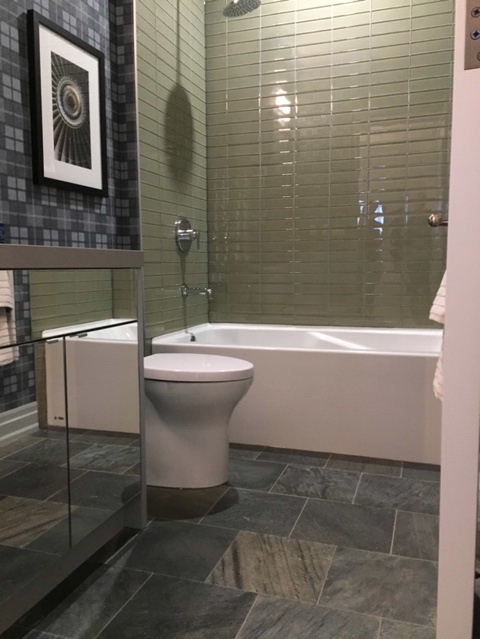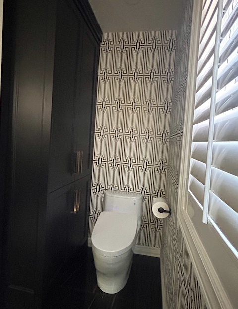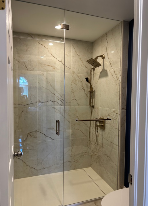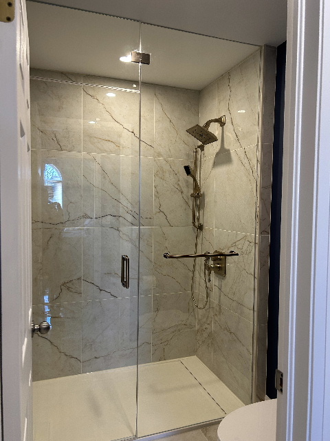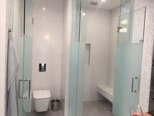 Privacy custom glass doors on shower & water closet entrances. |