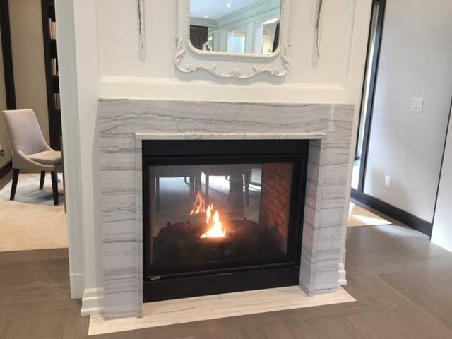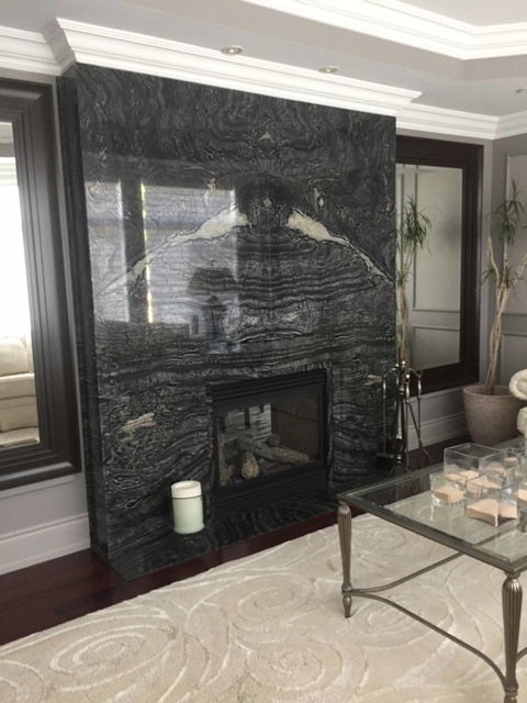 Book matched stone slab fireplace wall. |