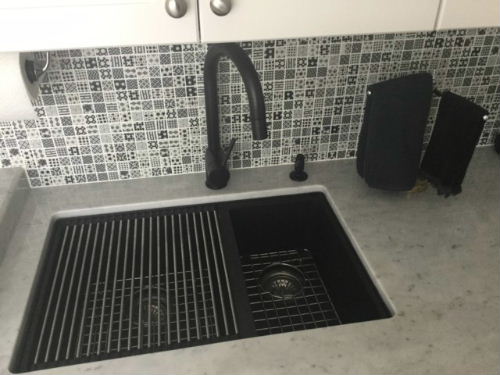 Fun mosaic backsplash & great Blanco sink