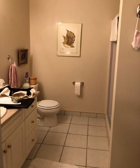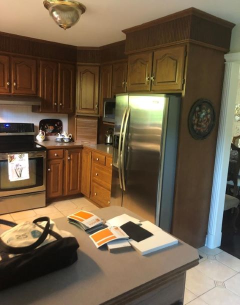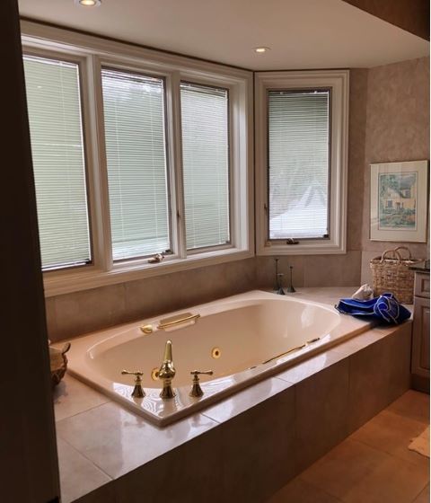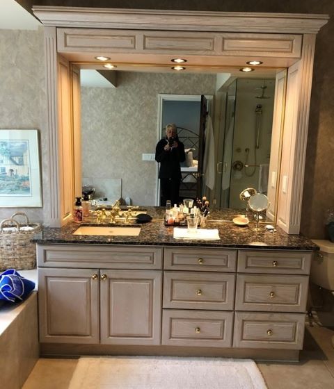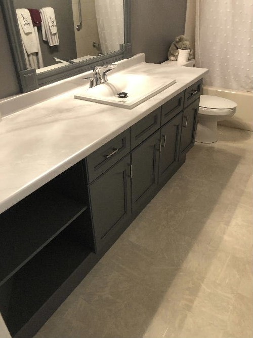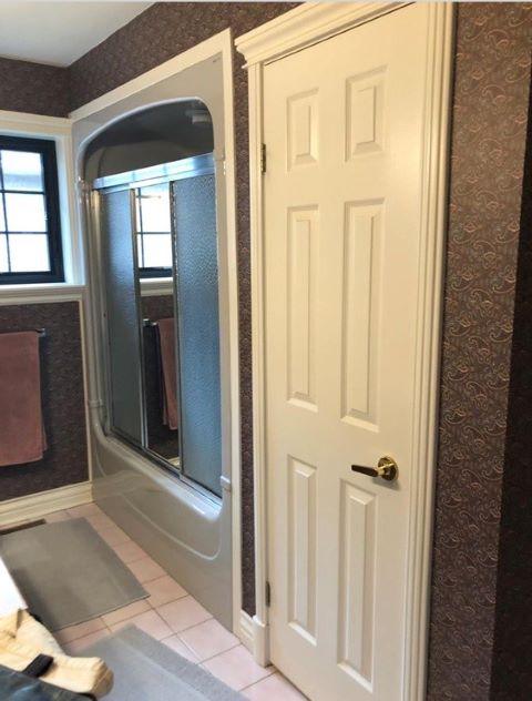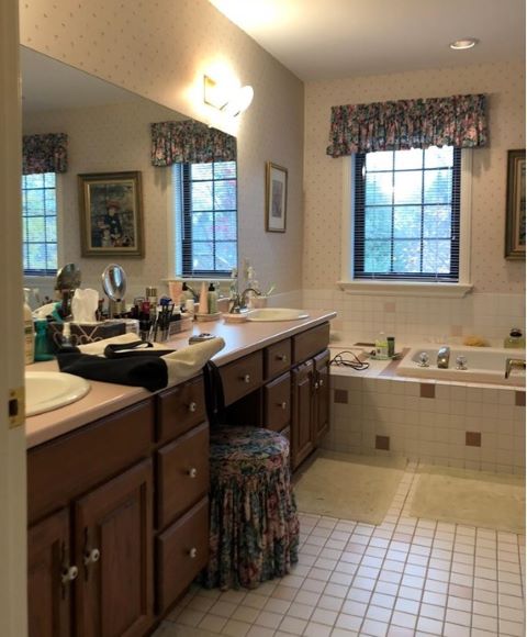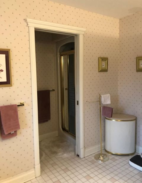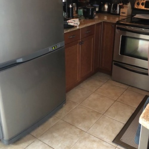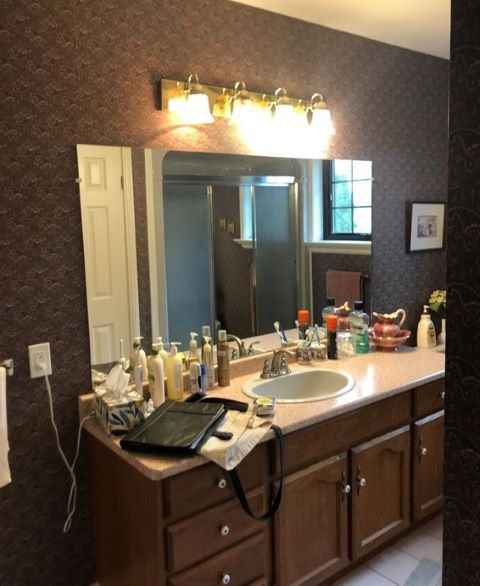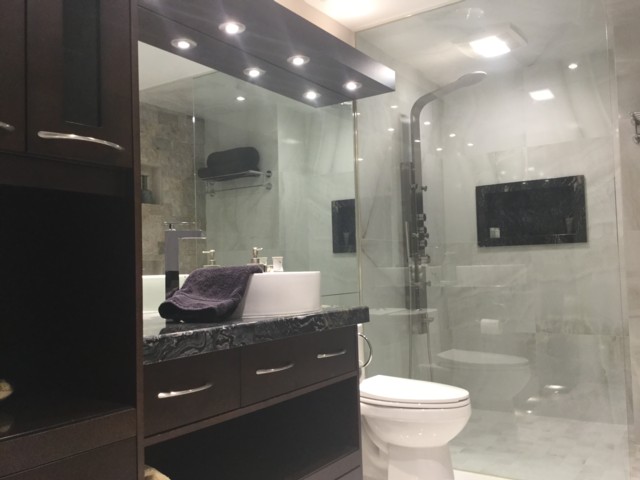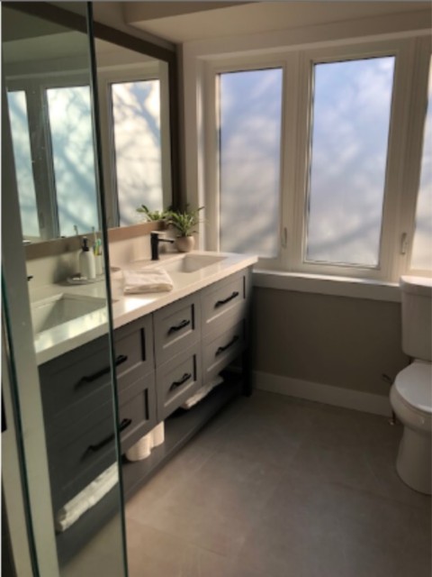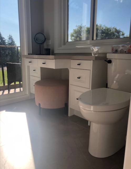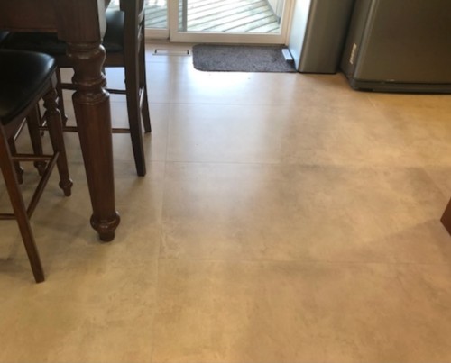 OUT with the old 12 x 12 ceramic tiles and IN with new 24 x 48 porcelain tiles. No more grout to clean ! And we put under floor heating in to keep the toes warm all year long ! |