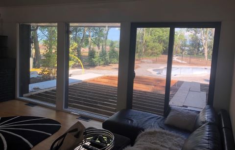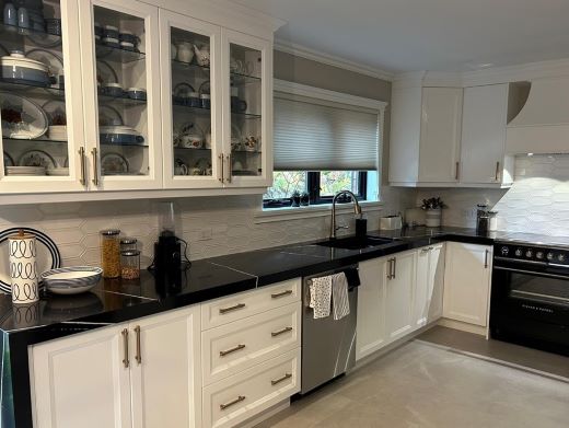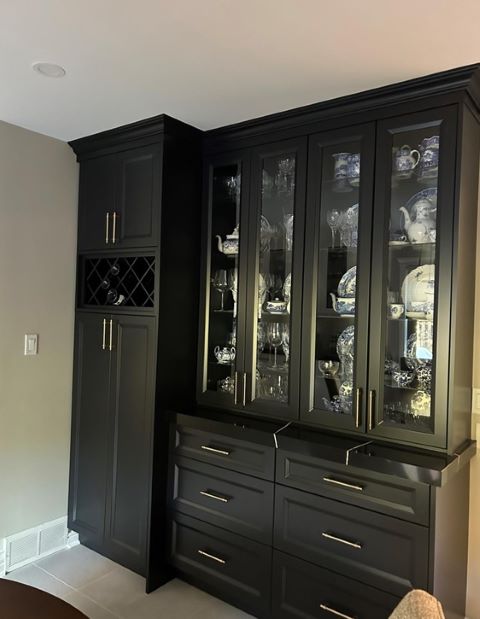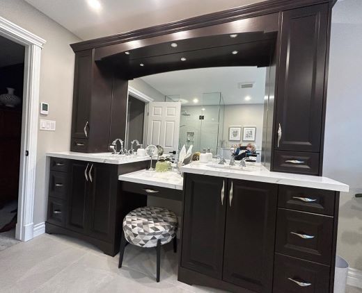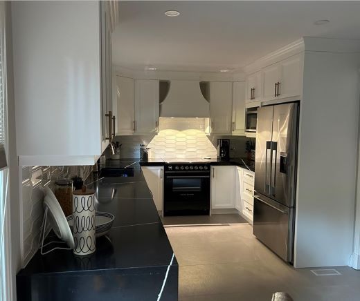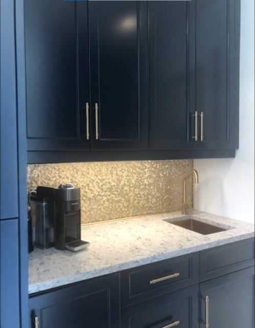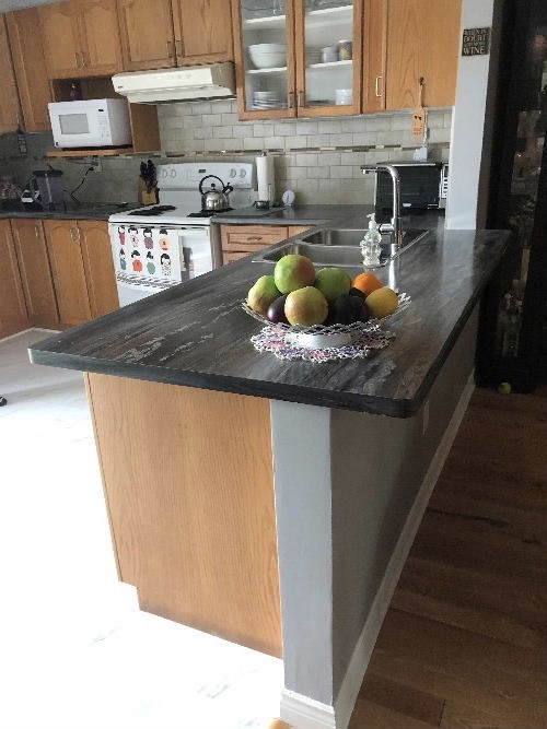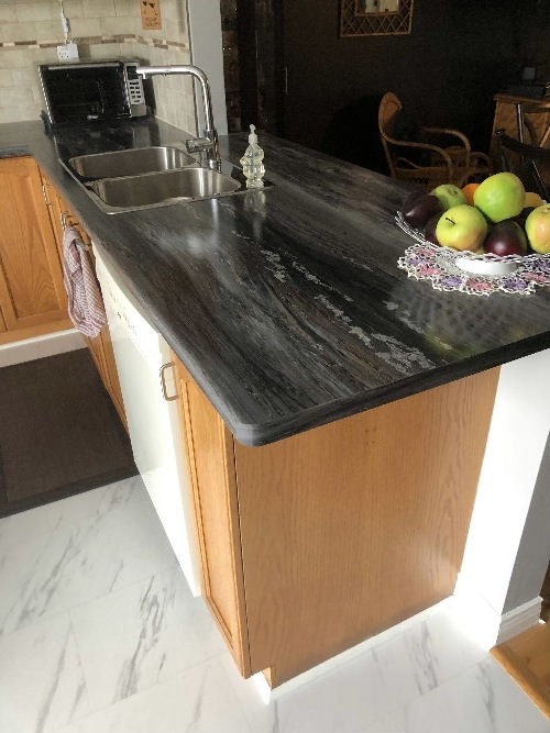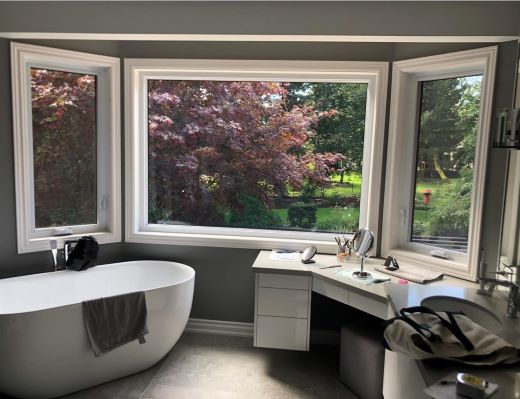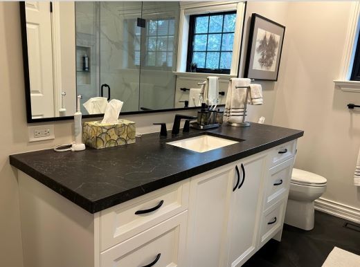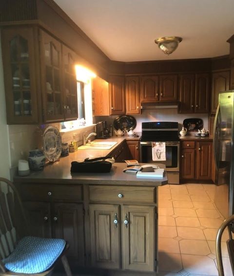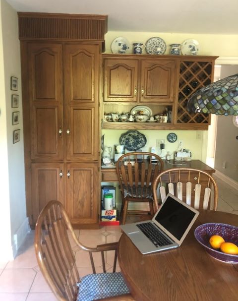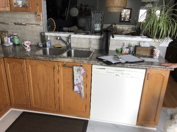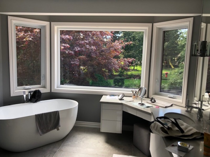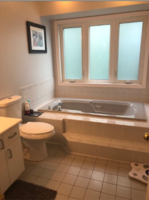 OUT with the old 12 x 12 ceramic tiles and IN with new 24 x 48 porcelain tiles. No more grout to clean ! And we put under floor heating in to keep the toes warm all year long ! |
